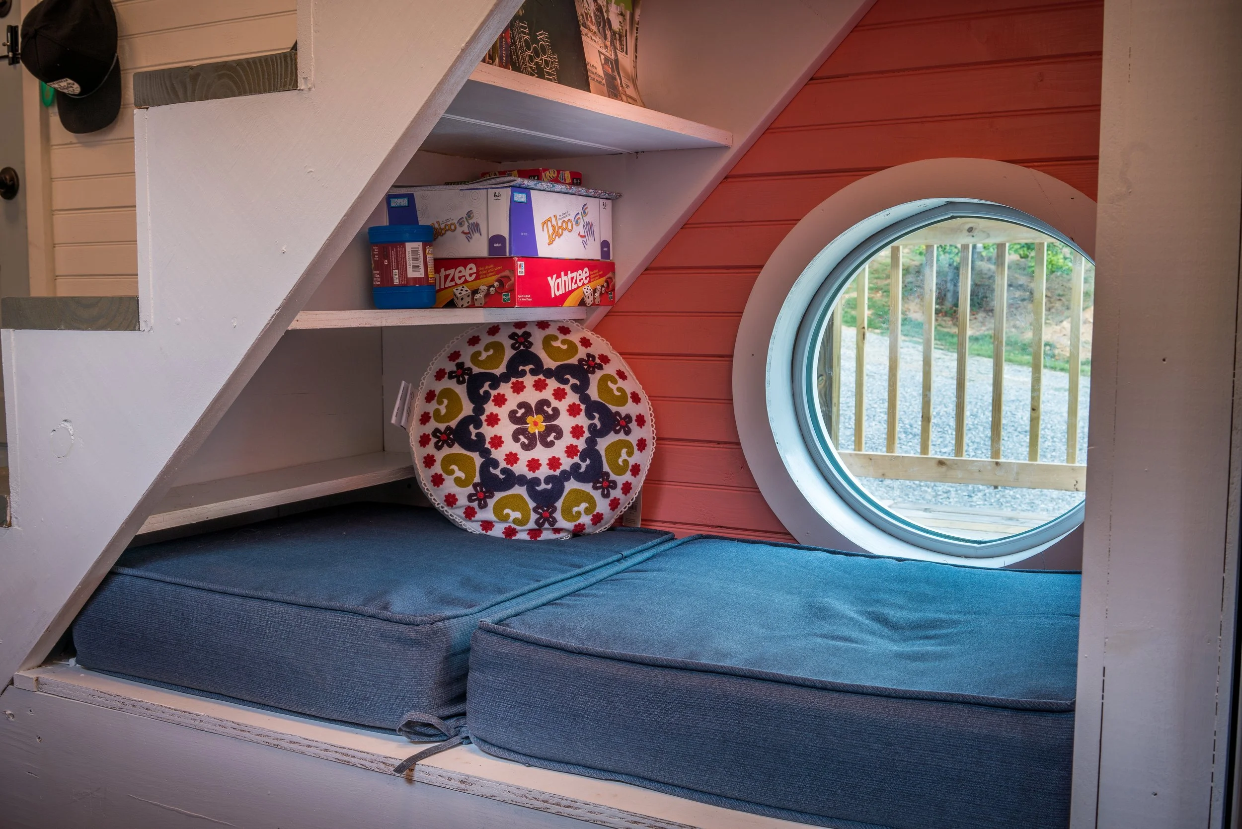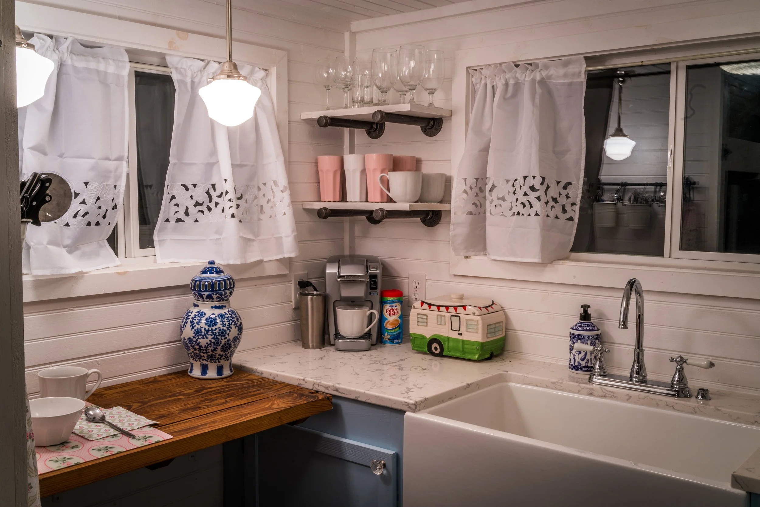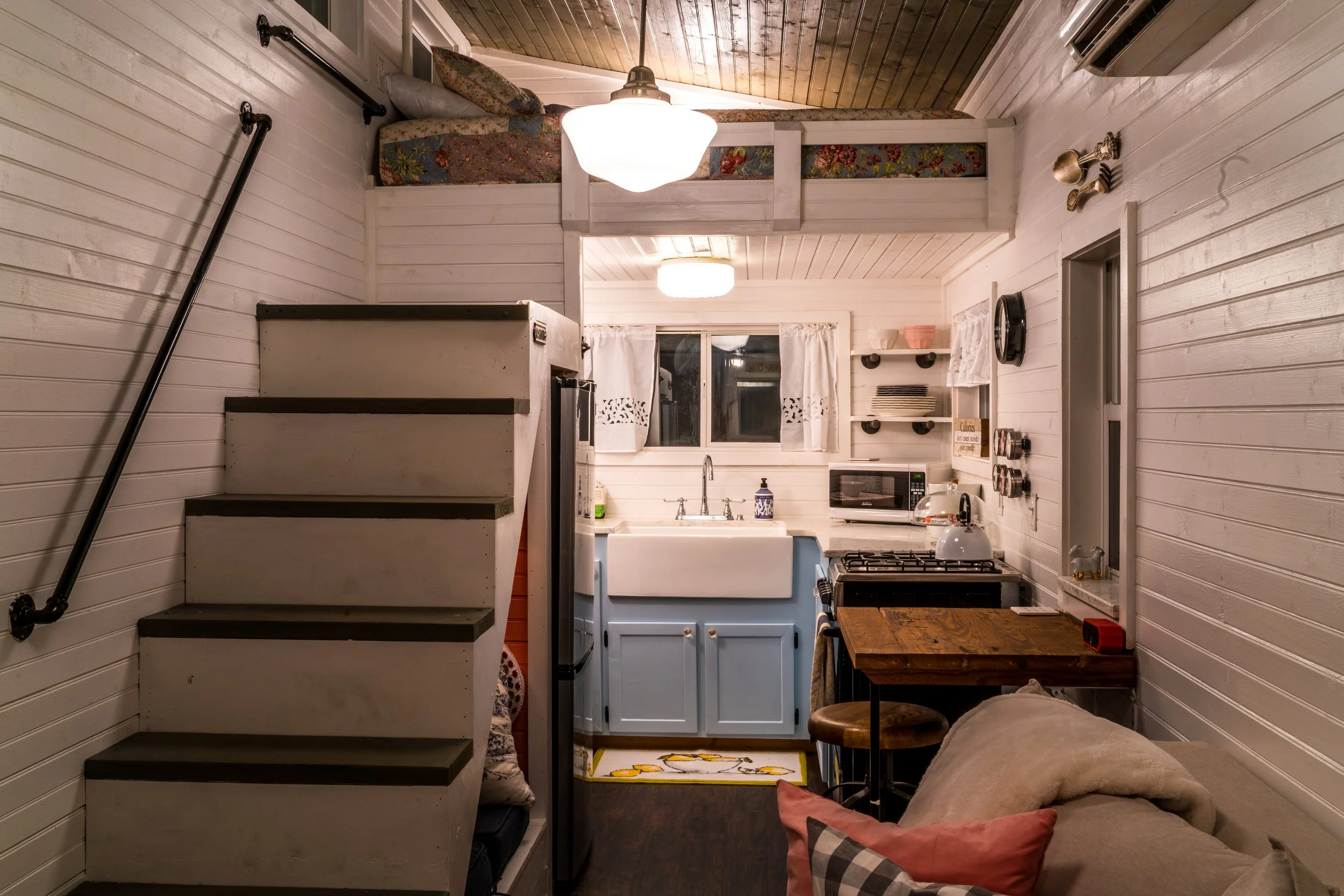 Glam meets farmhouse in the Instagram favorite, Old Blue Chair Tiny House, designed by Joe and his wife, Erin, and brought to life by the crew at Tennessee Tiny Homes. From the cedar siding, handcrafted dutch-door, and cozy reading nook hidden under the stairs, Old Blue Chair is the southern cottage escape you've been dreaming of. White-washed walls, huge farmhouse sink, spacious bathroom, dual lofts...yeah, just book it.